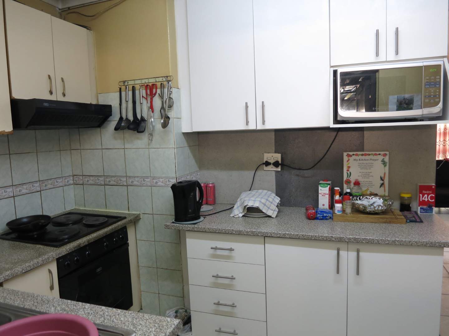 Kitchen with built in cupboard with stove and extractor fan.
