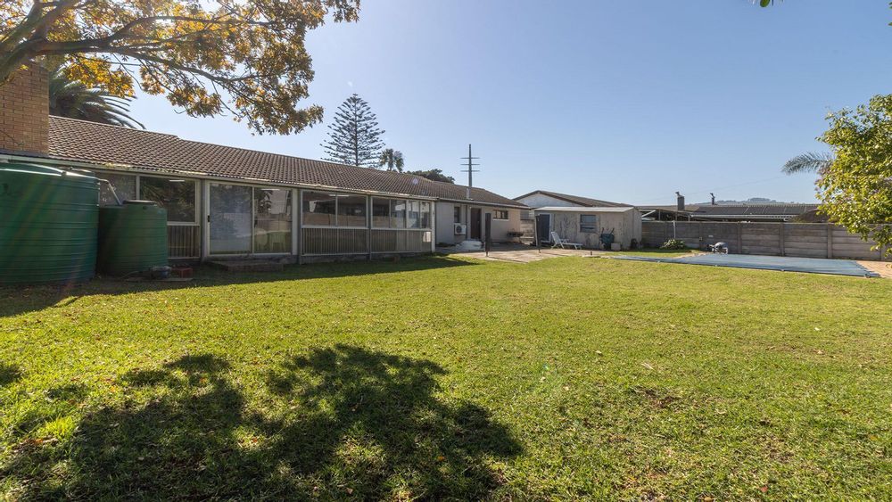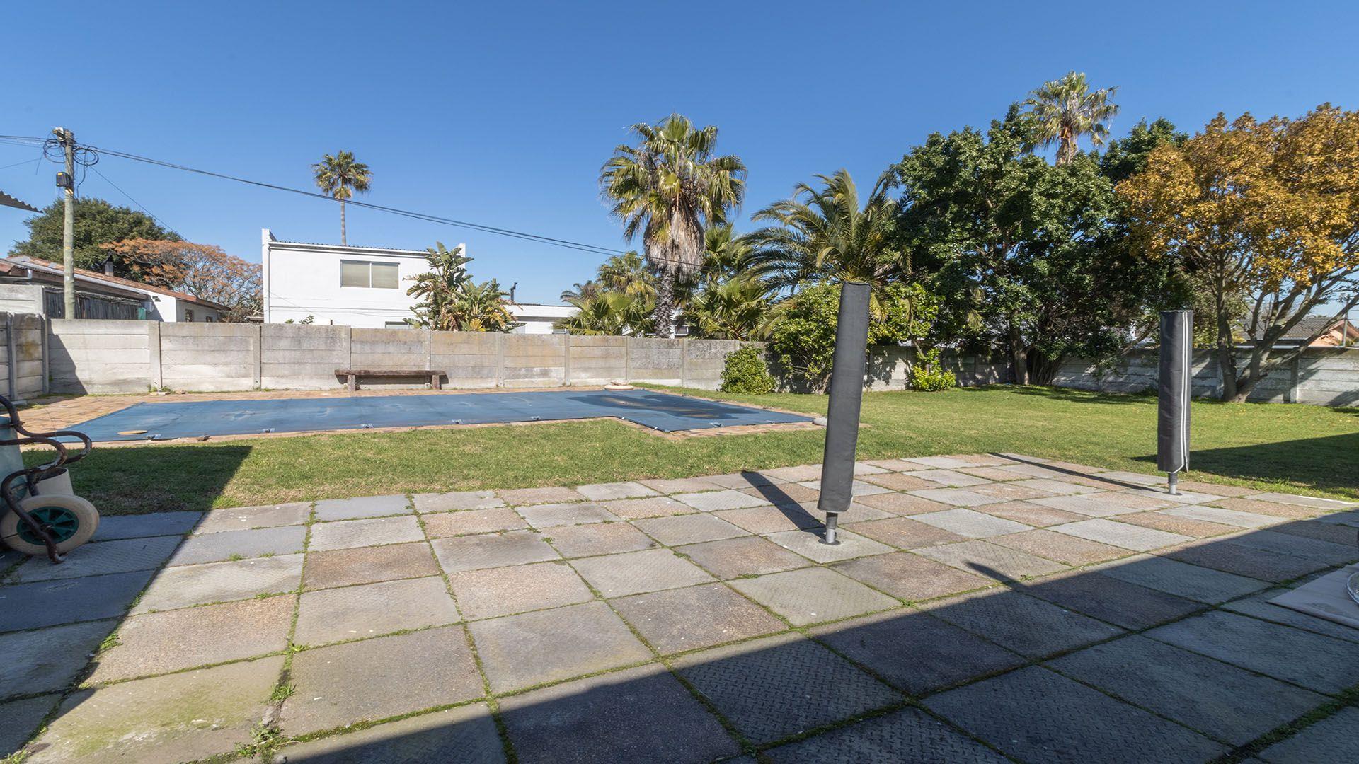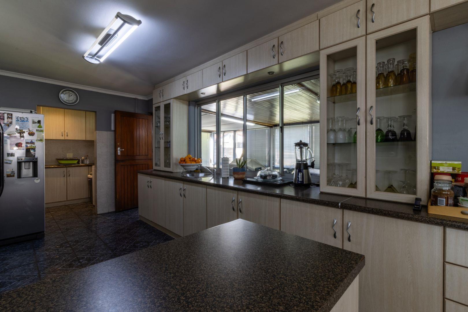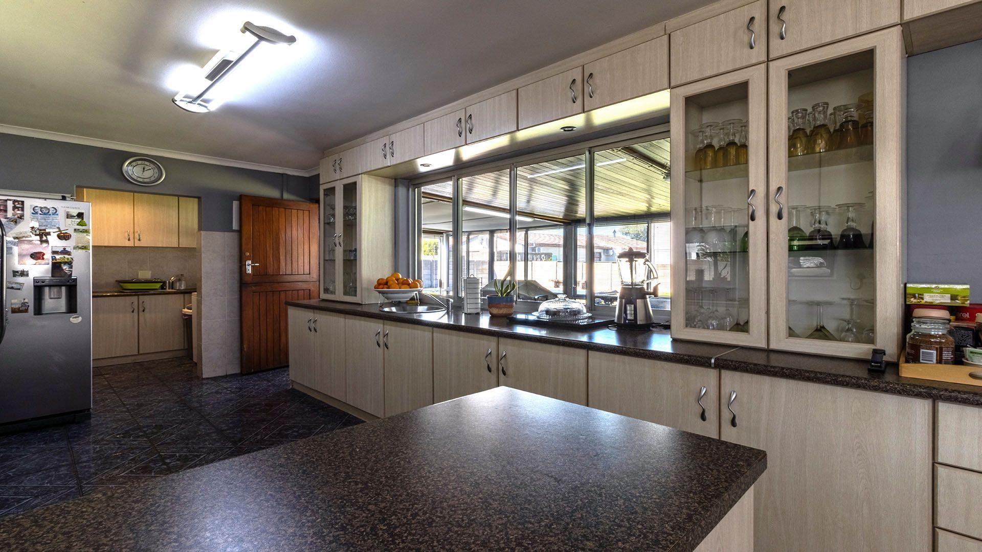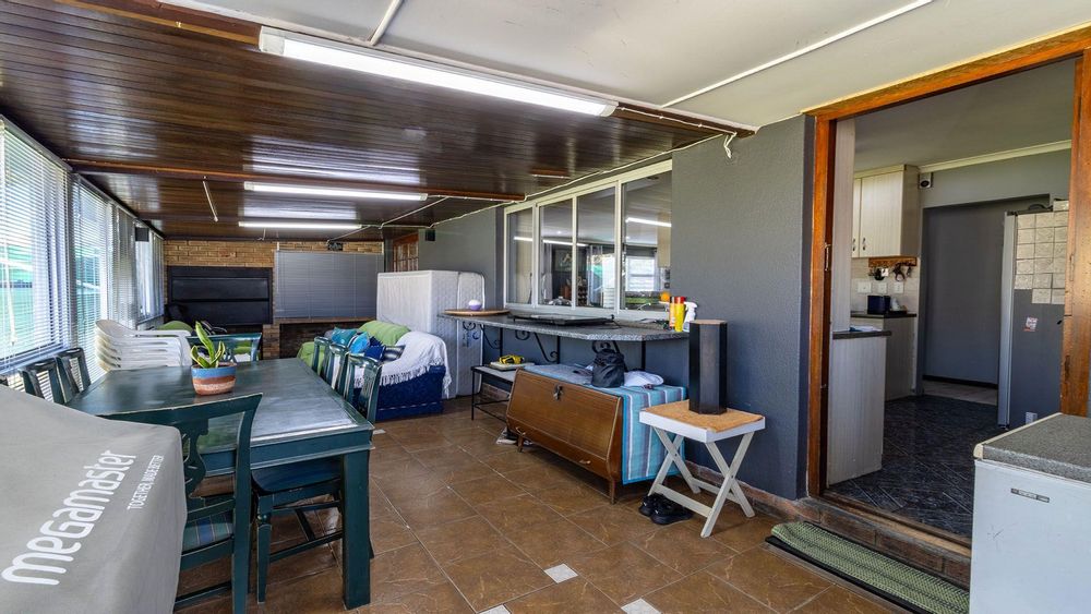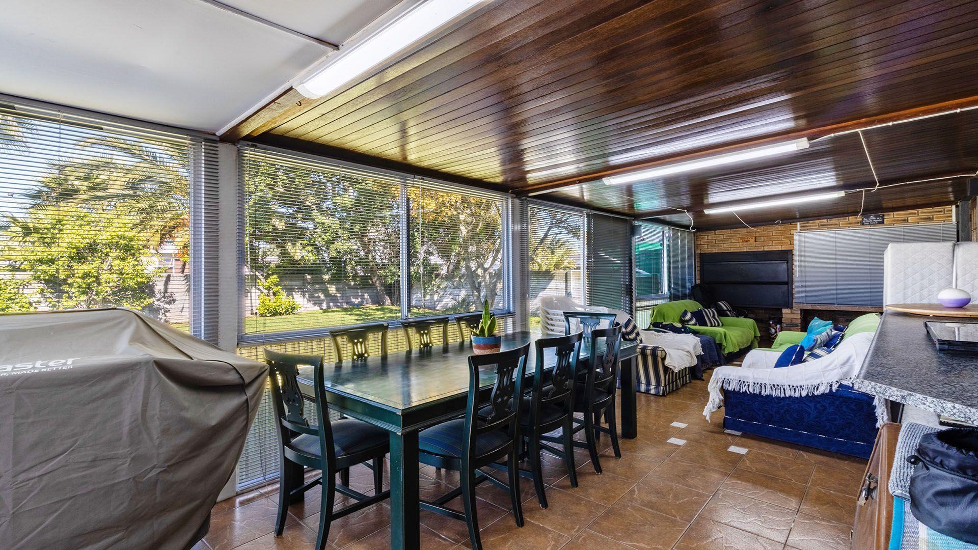 The lengthy Braai Room has access from the Lounge and the Kitchen and opens up over the spacious Back Yard with a sparkling blue swimming pool.